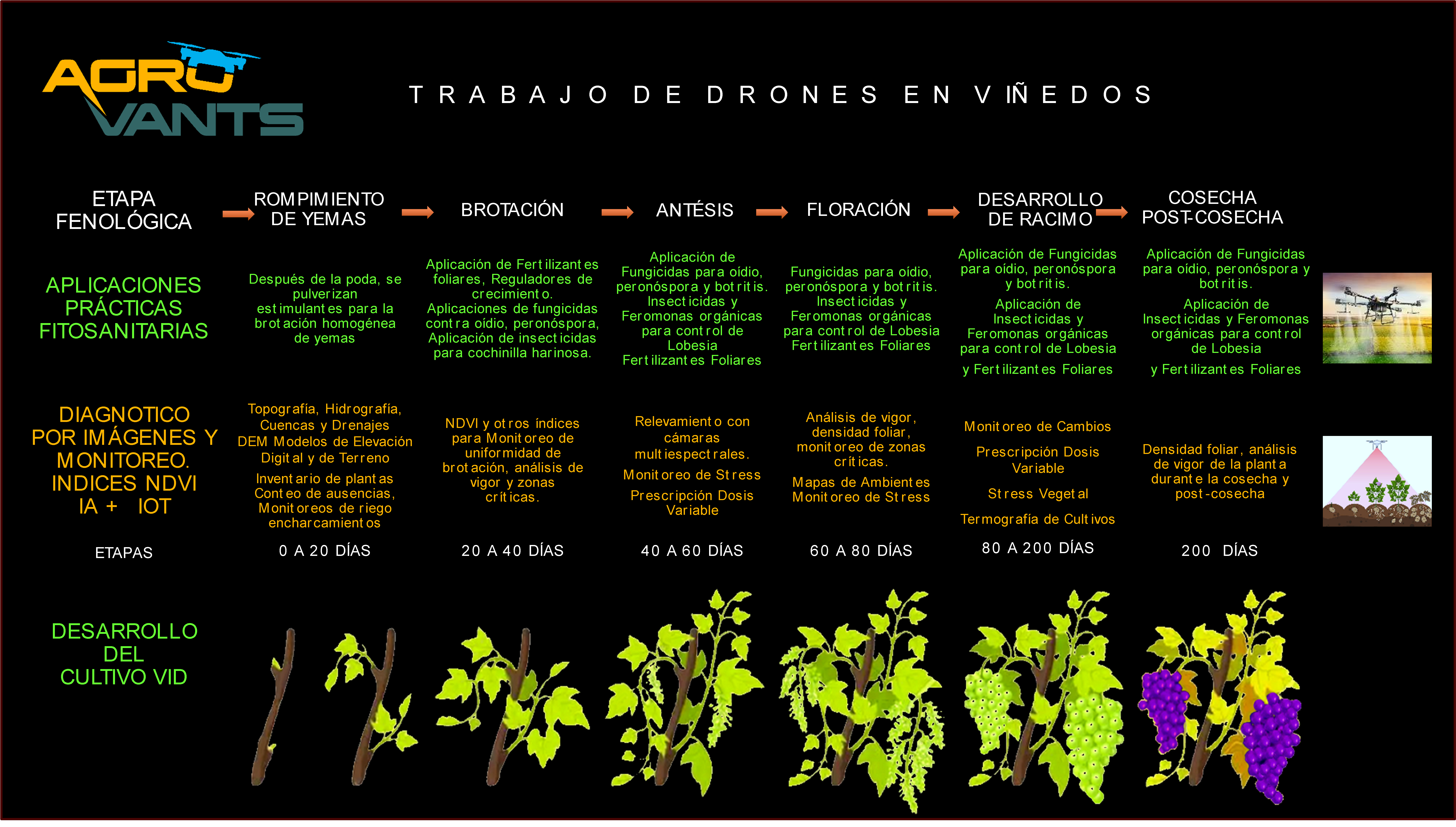Para la nueva temporada, nos complace presentar nuestro completo Programa de Nutrición y Fitosanidad diseñado específicamente para Viñedos. Este programa se adapta a las distintas etapas fenológicas del viñedo, brindando esquemas de servicios anuales que aseguran el máximo rendimiento y salud de sus cultivos. A lo largo de las seis etapas fenológicas, expresadas en días, se destacan las características clave y las opciones disponibles para la aplicación de productos nutricionales y fitosanitarios, tanto orgánicos como químicos.