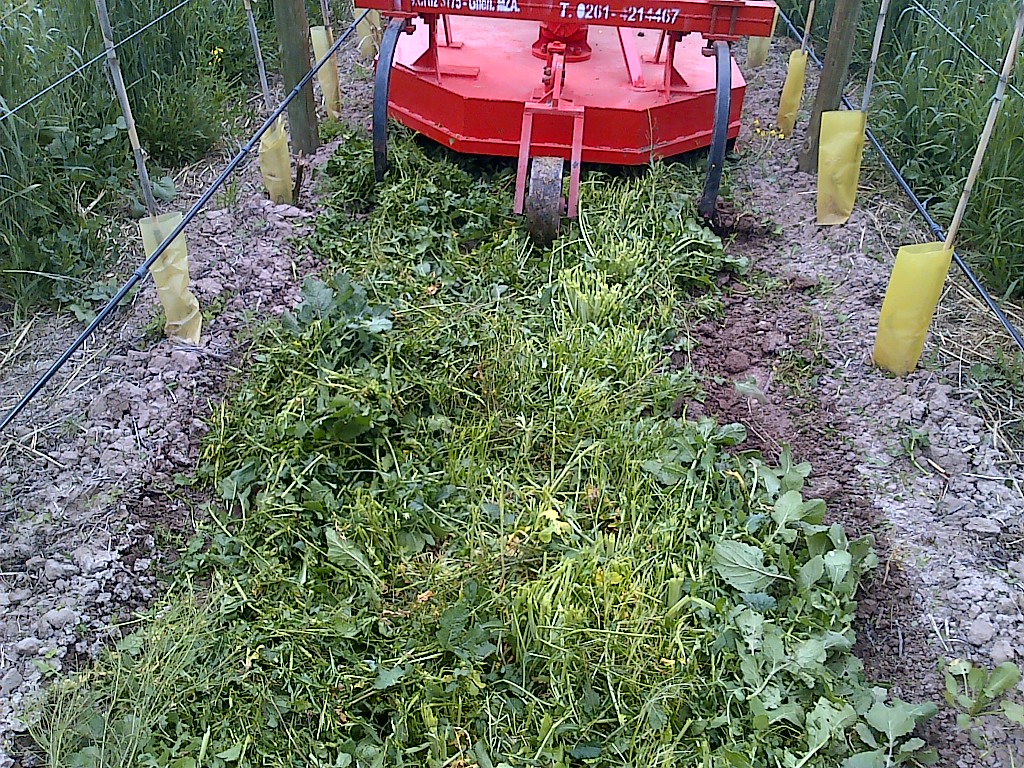Esta tarea se puede realizar con rastra o múltiple de manera de trozarlos e incorporarlos al suelo o simplemente segándolos con desmalezadora, de modo, que los restos queden sobre la superficie del camellón. En ambos el caso de que esta tarea se haga con rastra o múltiple se incorporan también al suelo los restos de poda.